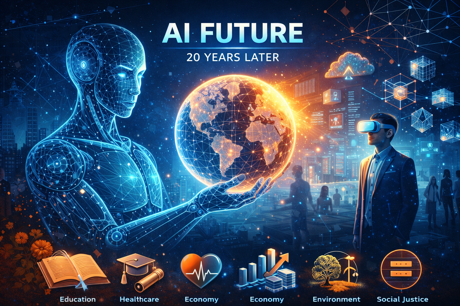 Introduction Artificial Intelligence (AI), robotics, cloud computing, blockchain, and generative models are not just buzzwords—they are the architects of a new world. Over the next two decades, these technologies will reshape every sector of human life: education, healthcare, the economy, personal wealth, social justice, environmental sustainability, and even how we define work, income, and social…