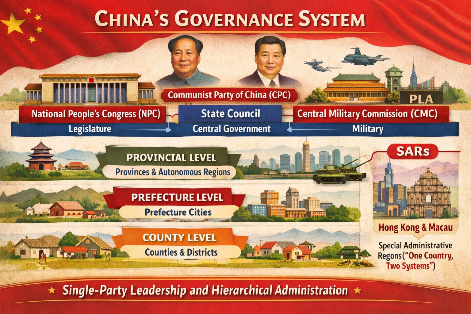 Introduction China represents one of the most distinctive governance systems in the contemporary world. Unlike liberal democracies that follow a multi-party electoral framework, China operates under a single-party socialist system led by the Communist Party of China (CPC). Its governance structure combines political centralization with administrative decentralization, enabling the state to manage a vast population,…