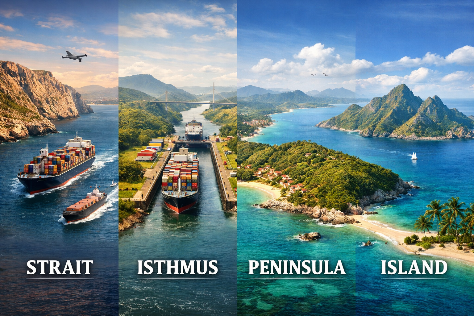 Geography is not only about mountains, rivers, and countries. Some of the most important geographical features that shape global trade, political power, and strategic control are narrow water passages, land bridges, and landforms surrounded by water. Concepts such as straits, isthmuses, peninsulas, and islands play a crucial role in international trade routes, naval strategy, and geopolitical relations.