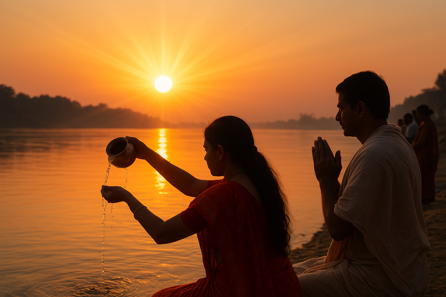 Devotees offer Arghya to the setting and rising Sun, symbolizing the cycle of life and death, dusk and dawn, karma and moksha. Fasting and standing in water during sunrise and sunset purify the mind, body, and spirit.